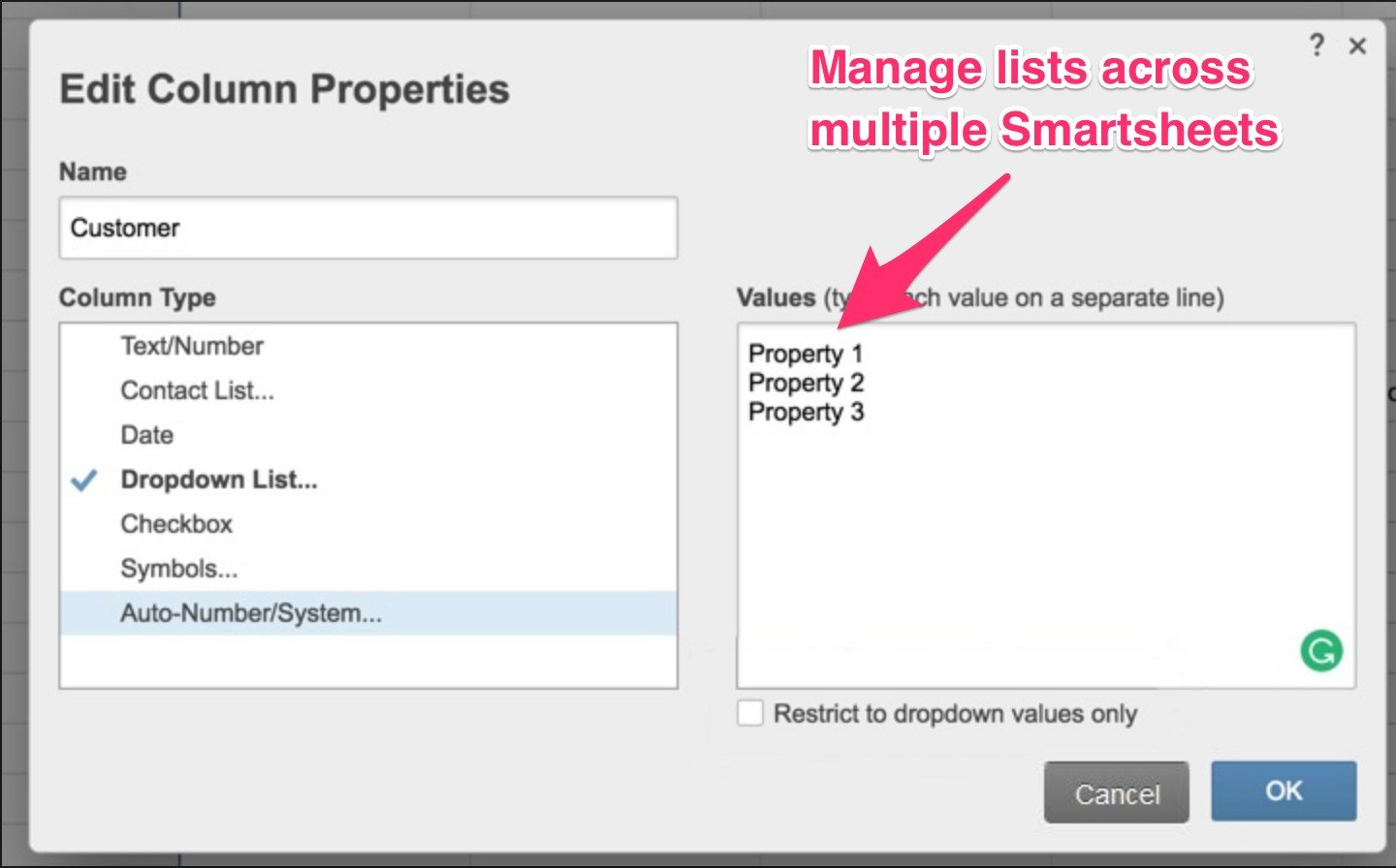 2. Automation. Whether you are managing one project or one hundred, Smarter Dropdown List Manager gives you full control of your dropdown lists from one central point. Update the assigned to column on one sheet, and it will automatically update as many sheets as you need, without having to go into each sheet and manually make the changes.